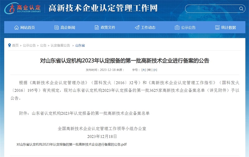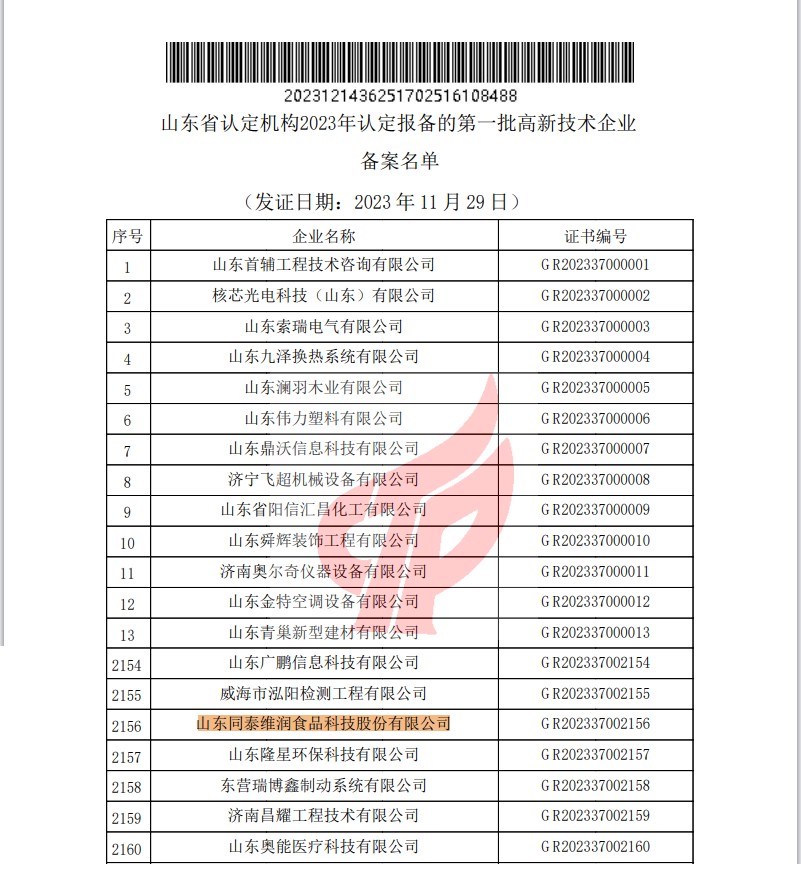 近日,全國高新技術(shù)企業(yè)認(rèn)定管理工作領(lǐng)導(dǎo)小組辦公室公示了山東省認(rèn)定機(jī)構(gòu)2023年認(rèn)定報(bào)備的第一批高新技術(shù)企業(yè)名單,山東同泰維潤食品科技股份有限公司再次通過認(rèn)定,被授予“國家高新技術(shù)企業(yè)”稱號。